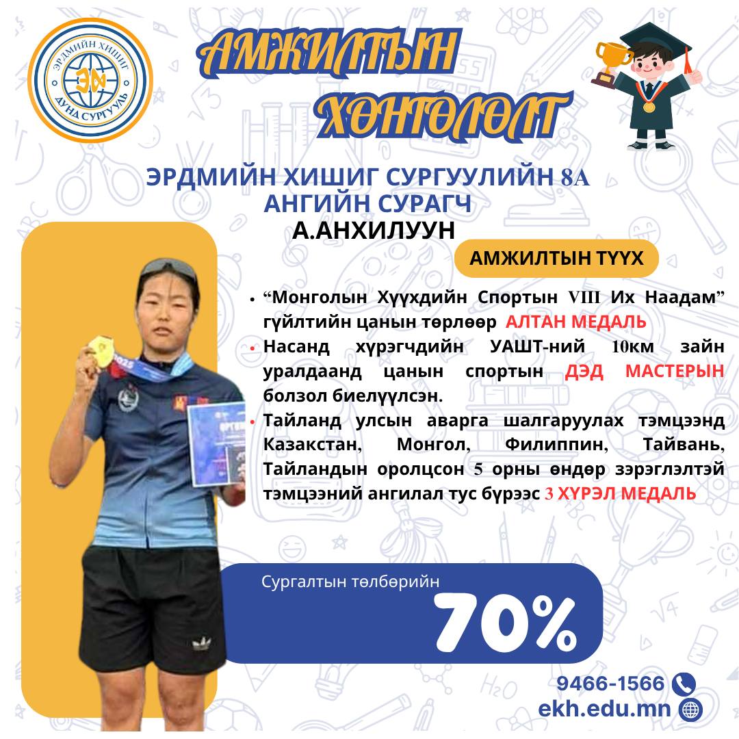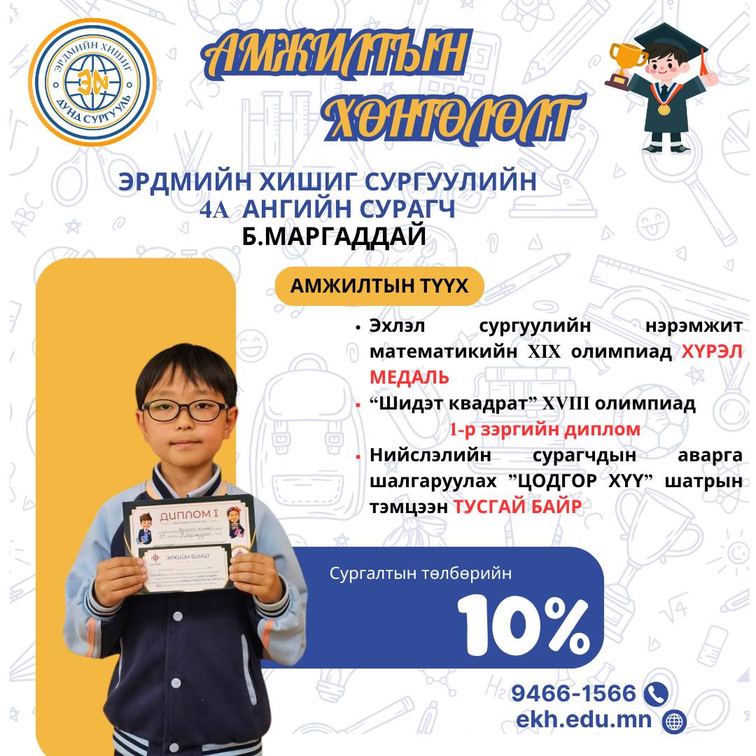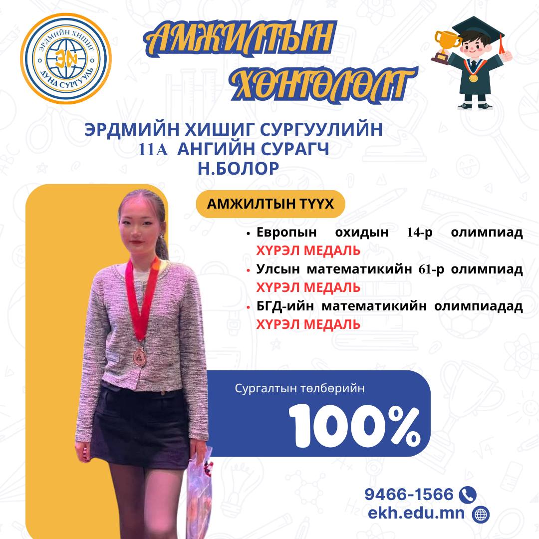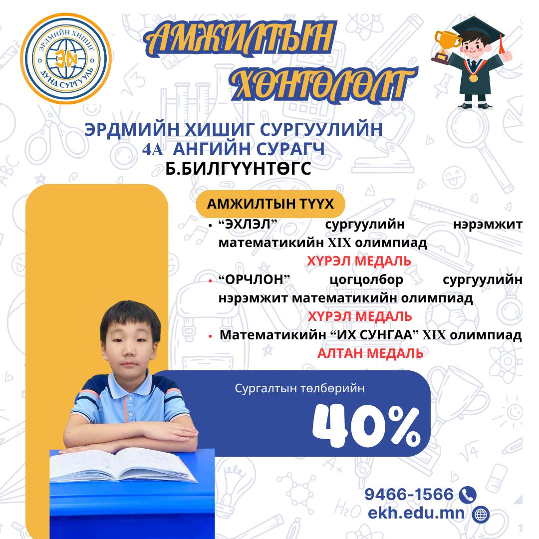 2024-2025 оны хичээлийн жилд анги хамт олноо манлайлан суралцаж олон улсын болон нэрэмжит сургуулийн олимпиадуудад амжилттай оролцсон сурагчид мөн спортын олон амжилт гаргасан дараах сурагчдад 2025-2026 оны хичээлийн жилд 10-100 хувийн сургалтын төлбөрийн хөнгөлөлт үзүүлж байна. Сурагчдадаа хичээл сурлага, спортын өндөр амжилт хүсье.
