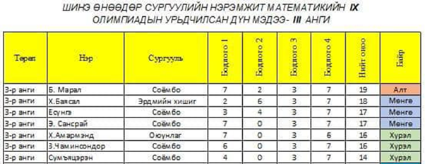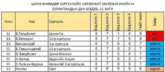 We have successfully participated in Mathematical Olympiad organized from school Shine Unuudur, and achieved 7th place with overall score. SILVER medalist – Bolor.N -11a
