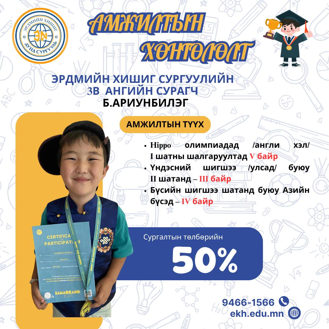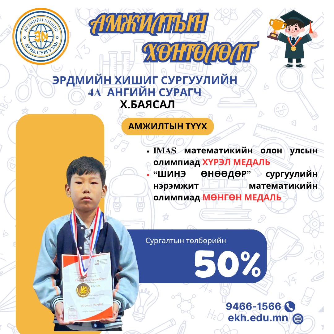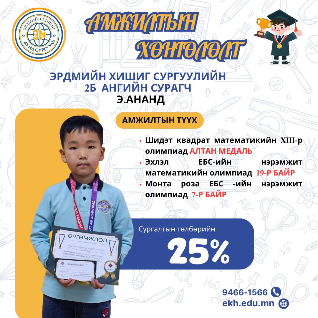 2024-2025 оны хичээлийн жилд анги хамт олноо манлайлан суралцаж олон улсын болон нэрэмжит сургуулийн олимпиадуудад амжилттай оролцсон сурагчид мөн спортын олон амжилт гаргасан дараах сурагчдад 2025-2026 оны хичээлийн жилд 10-100 хувийн сургалтын төлбөрийн хөнгөлөлт үзүүлж байна. Сурагчдадаа хичээл сурлага, спортын өндөр амжилт хүсье.