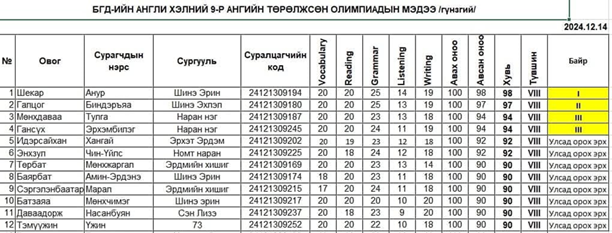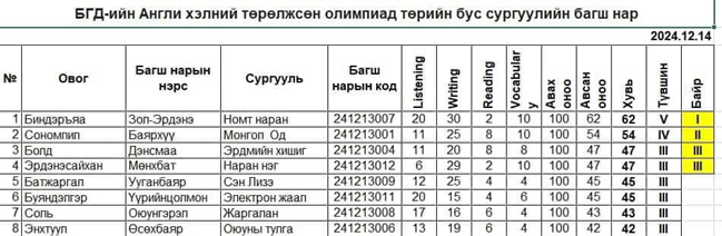 2024.12.13-ны өдөр Англи хэл судлагдахууны дүүргийн "Төрөлжсөн олимпиад" амжилттай зохион байгуулагдаж, 9-р анги гүнзгийрүүлсэн төрөлд тус сургуулийн 9а ангийн сурагч Т.Мөнхжаргал , С.Марал нар амжилттай оролцож " улсад оролцох эрх", Мэргэжлийн багшийн ангилалд багш Б.Дэнсмаа 3-р байр эзэлж бахдам сайхан амжилтыг үзүүллээ.