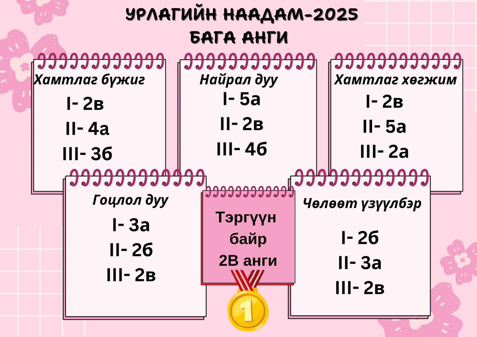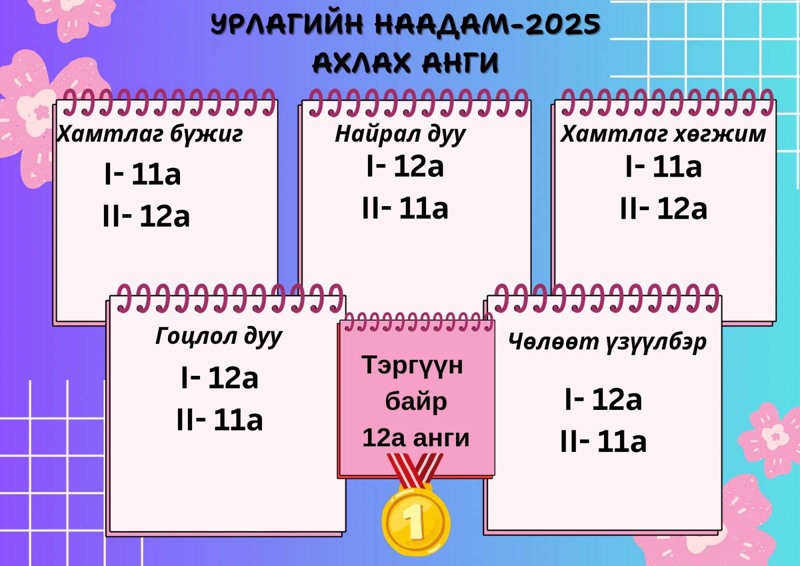 Сурагчдын авьяас чадварыг нээн хөгжүүлэх, анги хамт олныг эв нэгдэлтэй болгох, чөлөөт цагаа зөв боловсон өнгөрүүлэх зорилготой уг тэмцээнд авьяас чадвар авхаалж самбаагаа дайчлан оролцсон нийт сурагчдадаа болон тэргүүлсэн анги хамт олонд халуун баяр хүргэж урлаг сурлагын өндөр амжилт хүсье.