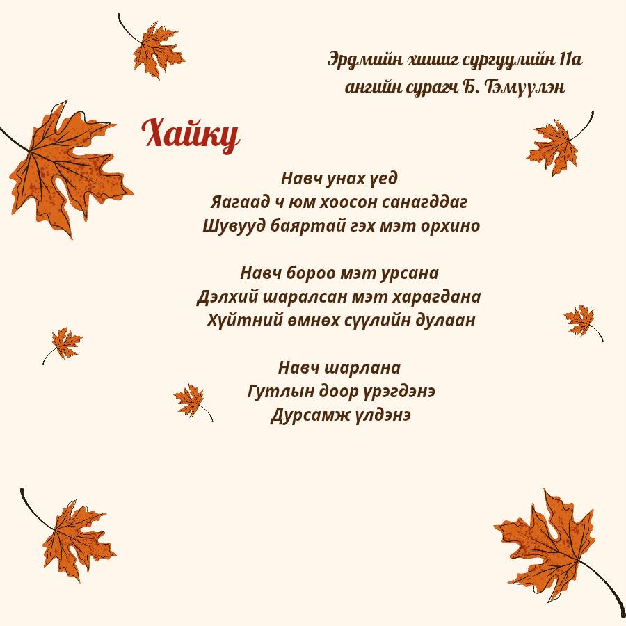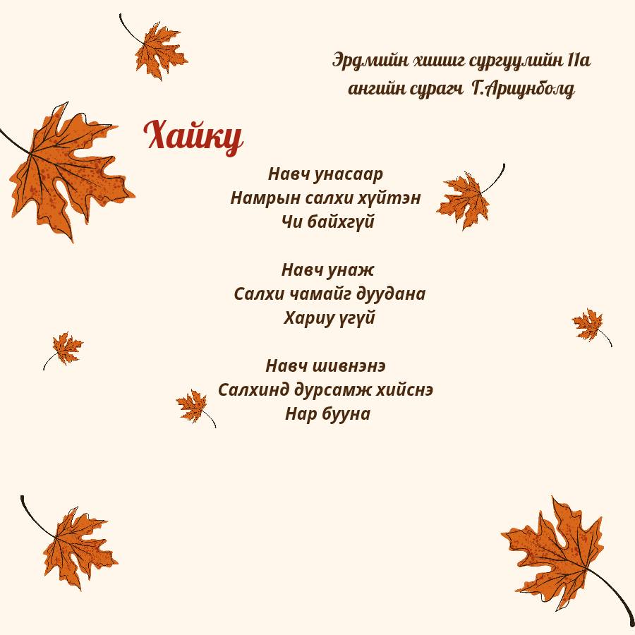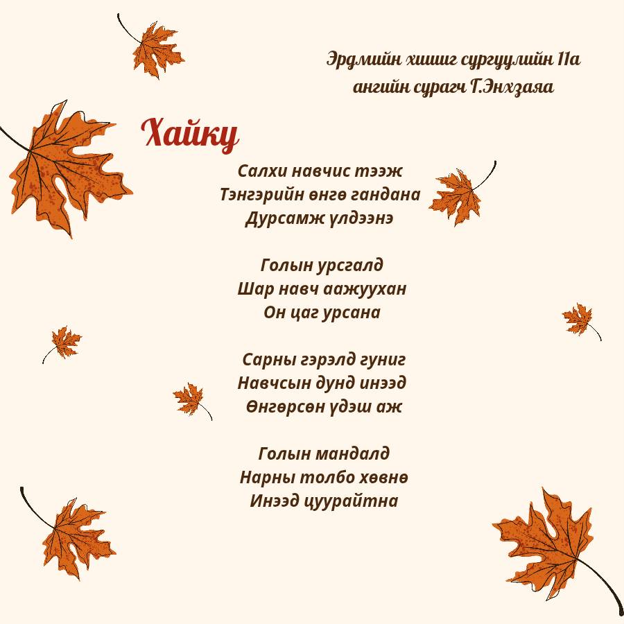 11-р ангийн Уран зохиолын хичээл "Хайку яруу найргийн төрөл зүйлийг танин мэдэж дуурайн зохиох" сэдэвт хичээлийн хүрээнд 11а ангийн сурагчид маань Намар сэдвийн хүрээнд дараах Хайку шүлгийг зохиож өөрийн мэдрэмж сэтгэгдэл, үзэл бодлоо ийнхүү шүлгээр дамжуулан илэрхийлэн бичжээ.