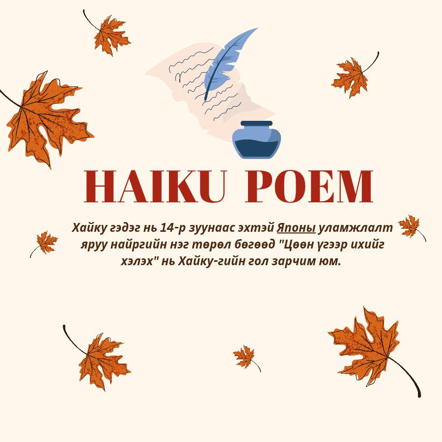 11-р ангийн Уран зохиолын хичээл "Хайку яруу найргийн төрөл зүйлийг танин мэдэж дуурайн зохиох" сэдэвт хичээлийн хүрээнд 11а ангийн сурагчид маань Намар сэдвийн хүрээнд дараах Хайку шүлгийг зохиож өөрийн мэдрэмж сэтгэгдэл, үзэл бодлоо  ийнхүү шүлгээр дамжуулан илэрхийлэн бичжээ.     Багш сурагчдадаа хичээл сурлагын амжилт хүсье.