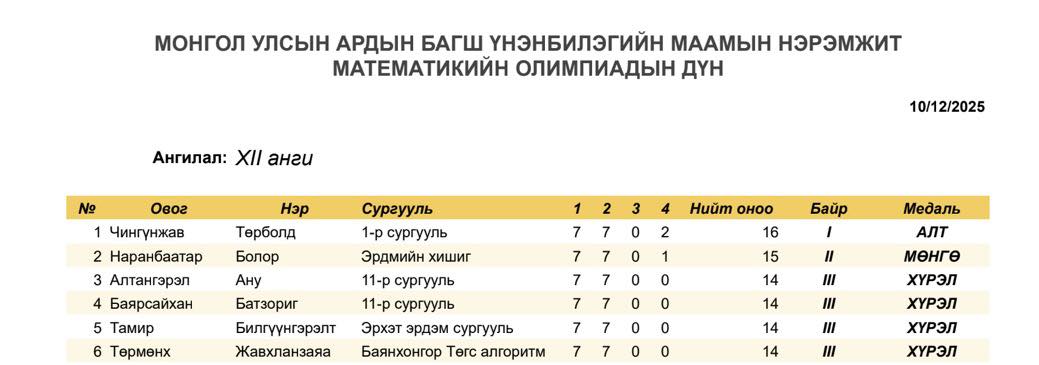 "МОНГОЛ УЛСЫН АРДЫН БАГШ ҮНЭНБИЛЭГИЙН МААМЫН НЭРЭМЖИТ МАТЕМАТИКИЙН ОЛИМПИАД-2025"-д амжилттай оролцсон 12а ангийн сурагч Н.Болортоо баяр хүргэе.