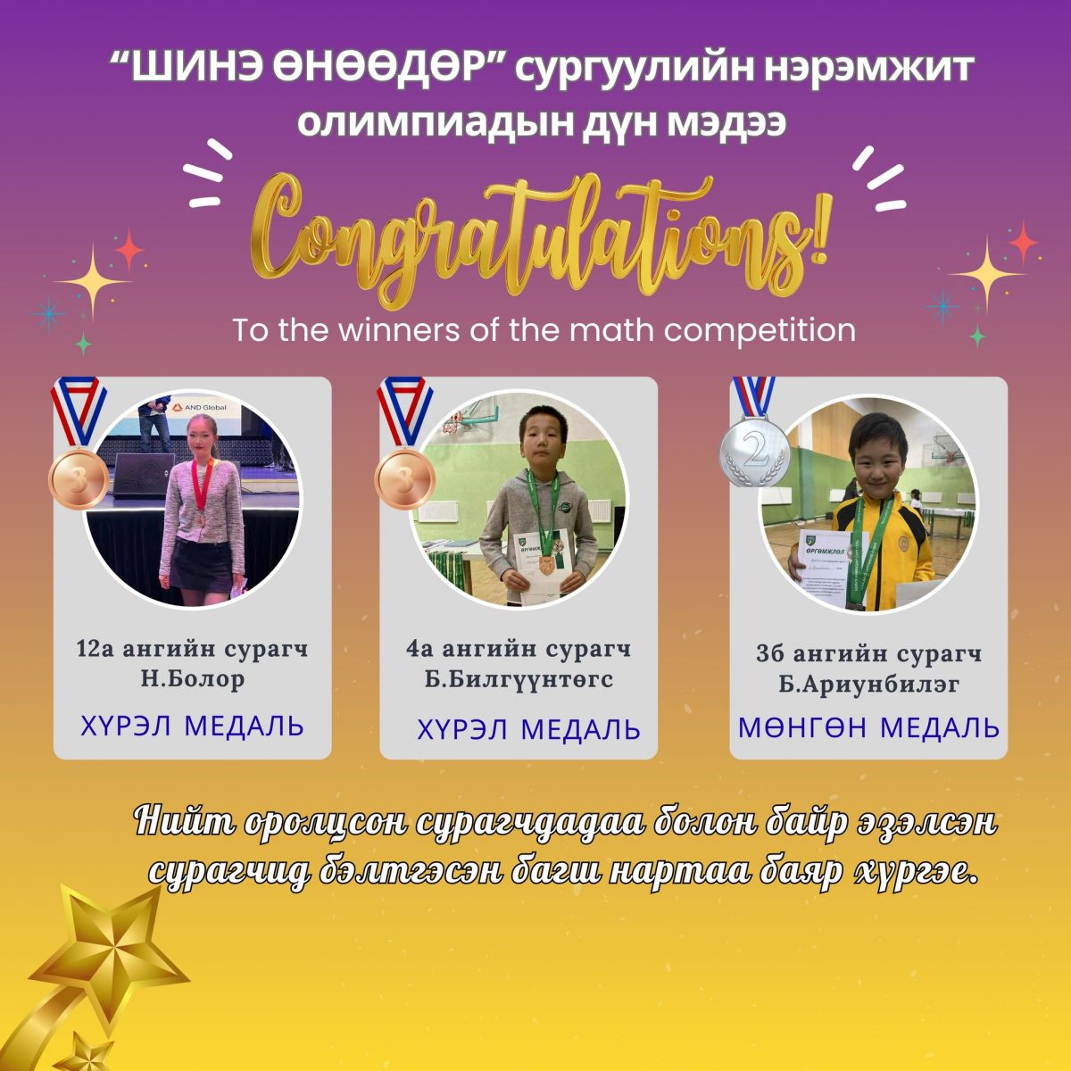 Шинэ-Өнөөдөр сургуулийн нэрэмжит математикийн X олимпиад 2-12 ангийн сурагчдын дунд 10 сарын 18-19-ны өдрүүдэд амжилттай явагдаж өндөрлөлөө. Манай сургуулийн сурагчид 2 хүрэл, 1 мөнгөн медаль хүртсэн амжилт үзүүлэхээс гадна бусад оролцсон сурагчид маань хэдий шагналт байранд ороогүй ч чамлахааргүй сайн оролцсон болохыг дурдахад таатай байна. Сурагчдадаа болон бэлтгэсэн багш нартаа баяр хүргэж цаашид болох олон олимпиад уралдаанд нь амжилт хүсье.