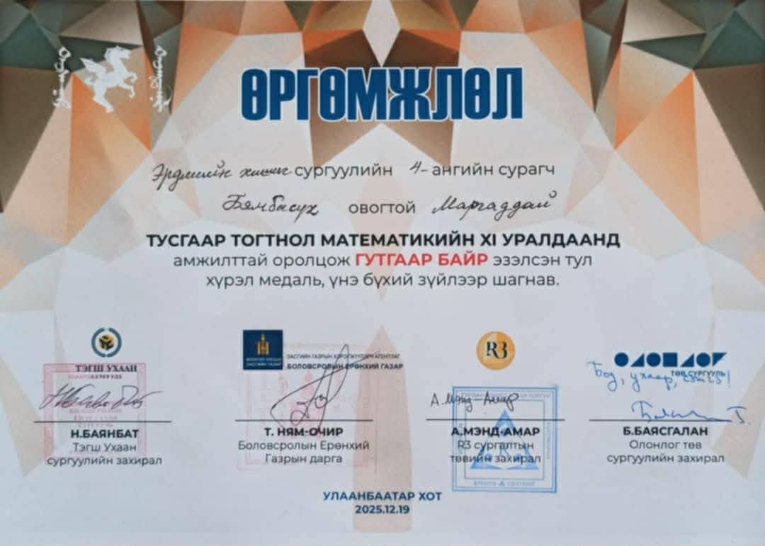 О. Мөнхцэцэг багштай 4а ангийн сурагч Б.Маргаддай тусгаар тогтнолын олон улсын математикийн ХI олимпиадад амжилттай оролцож хүрэл медаль хүртлээ.