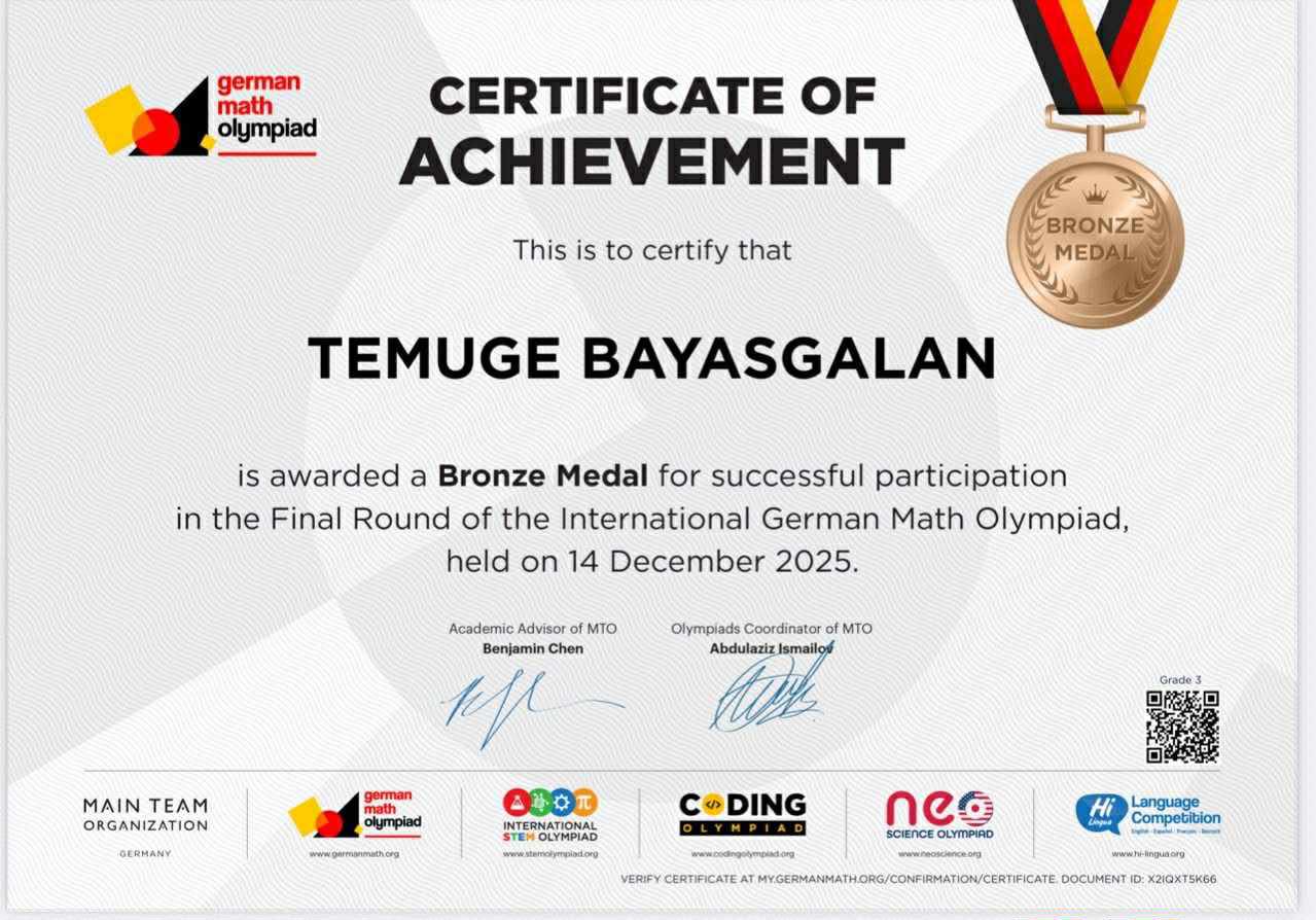 3б ангийн сурагч Б.Тэмүгэ нь Олон улсын математикийн “German math olympiad”-ын II шатанд хүрэл медаль авч ХБНГУ-ын Франкфурт хотод болох Гранд финалд оролцох эрхтэй болжээ.